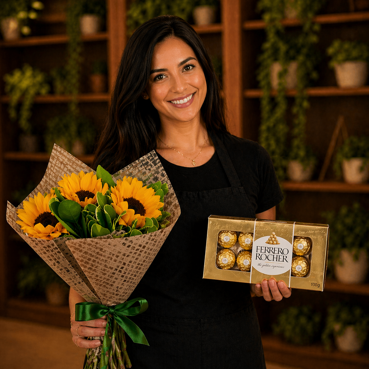 05 Girassóis, 01 ferrero rocher 100g, folhas verdes, Celofane, Laço decorativo e Caixa para viagem.