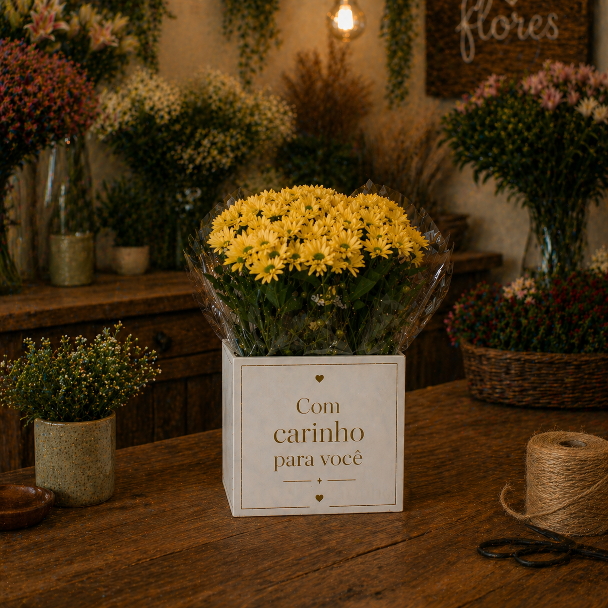Margaridas amarelas alegram o dia de quem as recebe, faça o teste! Plantadas e finalizadas em papel celofane personalizado.